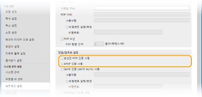 이메일 또는 I-팩스를 전송하기 전에 인증을 위해 POP3 서버를 사용하려면 확인란을 선택합니다.