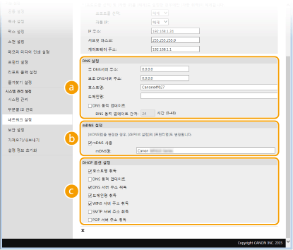 IPv4와 동일한 mDNS 이름을 사용하려면 확인란을 선택합니다. 다른 이름을 설정하려면 확인란의 선택을 해제하고 [mDNS명] 텍스트 상자에 mDNS 이름을 입력합니다. [DHCP 옵션 설정][DNS 서버 주소 취득]