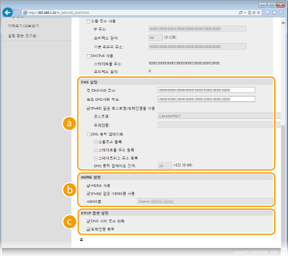 기기의 IP 주소가 변경될 때마다 DNS 레코드를 동적으로 업데이트하려면 확인란을 선택합니다. DNS 서버에 등록할 주소 유형을 지정하려면 [수동주소 등록], [스테이트풀 주소 등록] 또는 [스테이트리스 주소 등록]의 확인란을 선택합니다. 업데이트 간격을 지정하려면 [DNS 동적 업데이트 간격] 텍스트 상자에 시 단위로 시간을 입력합니다. [mDNS 설정][mDNS 사용]