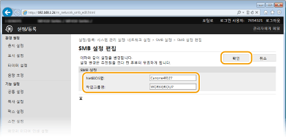 SMB(Server Message Block)는 파일과 프린터 등의 리소스를 네트워크에 연결된 2개 이상의 장치와 공유하기 위한 프로토콜입니다. 본 기기는 SMB를 사용하여 스캔한 문서를 공유 폴더에 저장합니다. 네트워크에 따라 NetBIOS 이름과 작업그룹명을 설정해야 하는 경우도 있습니다.