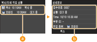 ![]() <복사/인쇄 작업 상황>처리 중이거나 복사 중 또는 처리 대기 중인 문서 목록을 표시합니다.