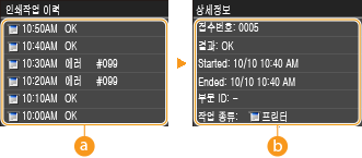 ![]() <인쇄작업 이력>인쇄된 문서 목록을 표시합니다. 문서가 성공적으로 인쇄된 경우 <OK>가 표시되고, 취소되거나 에러가 발생하여 문서를 인쇄하지 못한 경우 <에러>가 표시됩니다.