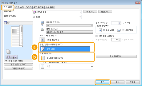 단면 및 양면으로 모두 인쇄할 수 있습니다. 기본 설정은 [양면 인쇄]입니다. 필요에 따라 설정을 변경합니다.