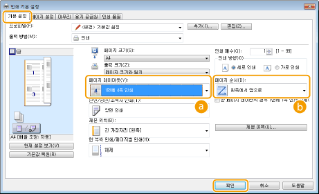 여러 장의 페이지를 한 장에 인쇄할 수 있습니다. 예를 들어, [1면에 4쪽 인쇄] 또는 [1면에 9쪽 인쇄]를 사용하여 4페이지 또는 9페이지를 한 장에 인쇄할 수 있습니다. 용지를 절약하거나 문서를 축소판으로 보려는 경우 이 기능을 사용합니다.