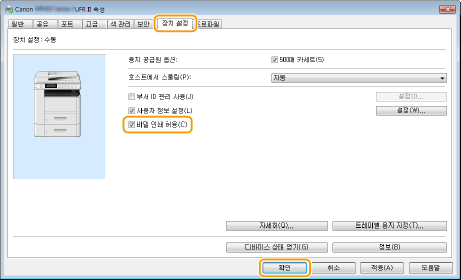 [디바이스 설정] 탭을 클릭하고 [비밀 인쇄 허용] 확인란이 선택되어 있는지 확인합니다.