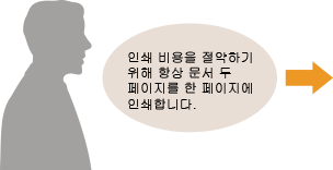 프린터 드라이버에서 [1면에 2쪽 인쇄]를 사용자 기본값으로 지정합니다. 다음 인쇄 작업부터는 항상 각 두 페이지가 축소되어 한 페이지에 인쇄됩니다. 기본 설정 변경