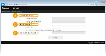모든 리모트 UI 작업과 설정을 수행할 수 있습니다. 시스템 관리자 ID를 지정한 경우 [시스템 관리자 ID]에 해당 ID를 입력하고 [시스템 관리자 PIN 번호]에 해당 PIN을 입력합니다.