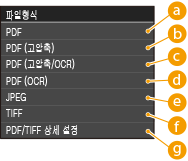 PDF/JPEG/TIFF 중에서 문서를 스캔할 파일 형식을 선택할 수 있습니다. PDF의 경우, 파일 크기가 축소된 고압축 PDF 파일 또는 OCR(Optical Character Recognition)로 만들어진 텍스트 검색이 가능한 PDF 파일을 선택할 수 있습니다.