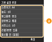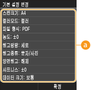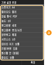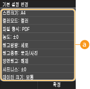 을 누를 때 표시되는 설정입니다. 이러한 기본 설정을 자주 수행하는 작업에 맞게 변경하면 스캔할 때마다 동일한 설정을 구성할 필요가 없습니다.