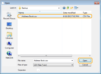 The file formats that can be read into the fax driver are the following three: CSV file (*.csv), Canon Address Book file (*.abk), and device configuration information file (*.dcm).
