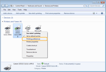 Right-click the printer driver icon for this machine and click [Printing preferences].