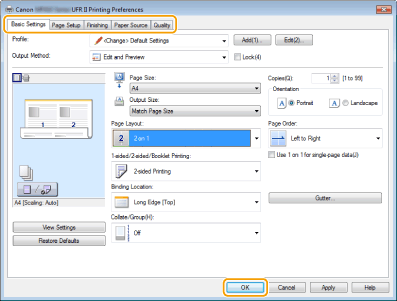 Click the [Basic Settings], [Page Setup], [Finishing], [Paper Source], or [Quality] tabs to specify the print settings on each screen as necessary.