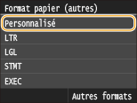 Si l'écran illustré ci-dessus ne s'affiche pas lorsque le papier est chargéSi vous chargez toujours le même papier dans le bac multifonctions, vous pouvez ignorer les opérations de configuration du papier en définissant par défaut le format et le type de papier. Notez que si un paramètre par défaut est enregistré, l'écran illustré ci-dessus ne s'affiche pas. Pour afficher l'écran, sélectionnez <Spécifier lors du chargement du papier> (Enregistrement des paramètres papier par défaut du bac multifonctions).