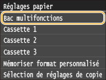 Une fois les paramètres papier par défaut enregistrés, l'écran de définition du papier ne s'affiche plus lorsque vous insérez du papier, et les mêmes paramètres sont appliqués systématiquement. Si vous chargez un papier de format ou de type différents sans modifier les paramètres papier, l'appareil risque de ne pas imprimer correctement. Pour éviter ce problème, sélectionnez <Spécifier lors du chargement du papier> à l'étape 3, puis chargez le papier.