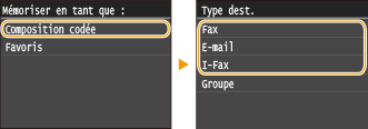 <Réglages fax>. Toutefois, les réglages effectués depuis <Carnet adress.> sont activés pour les paramètres détaillés des destinataires enregistrés dans le carnet d'adresses. |