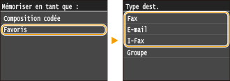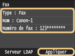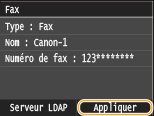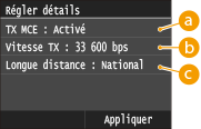 <Réglages fax>. Toutefois, les réglages effectués depuis <Carnet adress.> sont activés pour les paramètres détaillés des destinataires enregistrés dans le carnet d'adresses. |