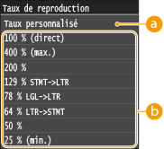 Vous agrandissez ou réduisez les copies en appliquant un taux de reproduction prédéfini, <STMT->LTR> par exemple, ou en définissant un taux de reproduction personnalisé par incréments de 1 %.