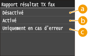 Lorsque vous sélectionnez <Activé> ou <Uniquement en cas d'erreur>, il est possible d'insérer une partie du fax dans le rapport. Réglez <Inclure image TX> sur <Activé>.