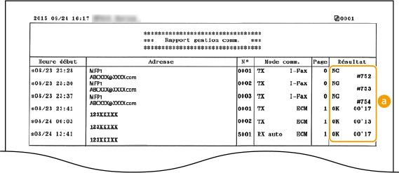 La mention "OK" indique que la transmission s'est bien déroulée alors que la mention "NG" suivie de trois chiffres (code d'erreur) signale un échec de la transmission (Si un code d'erreur apparaît). En cas d'envoi à une adresse e-mail, le rapport considère les résultats de la transmission entre l'appareil et le serveur de messagerie et non ceux entre l'appareil et l'adresse du destinataire à proprement parler.