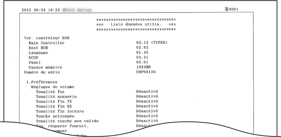 La <Liste des données utilisateur> ne comprend pas les listes d'options de réglage <Réglages réseau> et <Réglages de gestion du système> et une partie de la liste d'options de réglage <Réglages fax>. Pour consulter toutes les options de réglage, y compris les <Réglages réseau> et les <Réglages de gestion du système>, imprimez la <Liste des données administrateur système>.