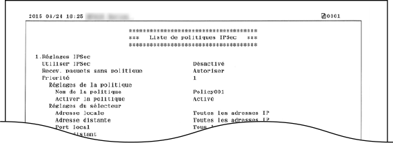 Vous examinez les noms de politiques et les réglages IPSec qui ont été enregistrés dans l'appareil en imprimant la liste des politiques IPSec.