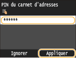 Si un code PIN a été configuré pour le carnet d'adresses, l'écran <PIN du carnet d'adresses> s'affiche pendant l'exportation. Saisissez le code PIN du carnet d'adresses et appuyez sur <Appliquer>. Appuyez sur <Ignorer> pour annuler l'exportation des données du carnet d'adresses.