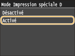 Si le problème persiste malgré la sélection de cette option, définissez <Mode Impression spéciale D> sur <Activé>. Mode Impression spéciale D