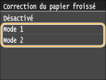 Si vous utilisez du papier avec des bords humides, les imprimés peuvent sortir froissés. La sélection de cette option peut résoudre ce problème. L'effet de l'amélioration est plus fort avec <Mode 2> qu'avec <Mode 1>.
