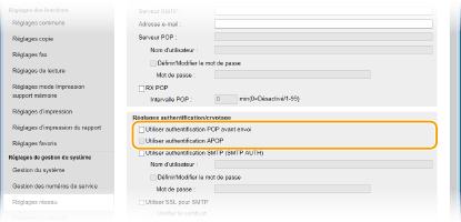 Pour utiliser le serveur POP3 afin d'exécuter une authentification avant l'envoi d'e-mails ou d'I-Fax, cochez la case.