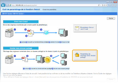 La fonction de numérisation avec stockage dans des dossiers partagés est également appelée "Numériser vers SMB", parce qu'elle repose sur la technologie Windows SMB (Server Message Block). SMB est un protocole prévu pour partager les ressources, par exemple les fichiers et les imprimantes, avec plusieurs périphériques du réseau (Configuration du protocole SMB). Pour configurer l'appareil afin d'enregistrer les documents numérisés dans un dossier partagé du réseau en SMB, indiquez l'emplacement du dossier à partir d'un ordinateur. Cette section explique comment définir l'emplacement d'enregistrement à l'aide de l'outil de paramétrage de la fonction d'envoi.