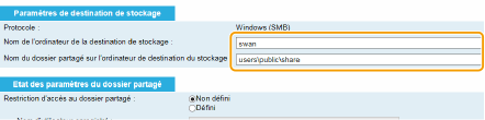 Saisissez le nom (ou le chemin d'accès) du dossier partagé. Si, par exemple, le dossier partagé est un sous-dossier nommé "share" (partage) et figure dans le dossier [Public] du lecteur C (chemin : C:\users\public\share), saisissez "users\public\share."