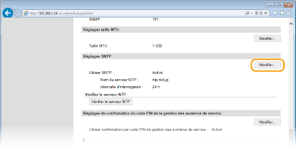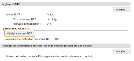 Test des communications avec le serveur NTP/SNTPVous pouvez afficher l'état des communications avec le serveur enregistrer en cliquant sur [Réglages/Enregistrement]