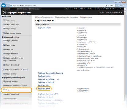 Vous pouvez activer ou désactiver les réglages SNMP à partir de <Menu>. Réglages SNMP