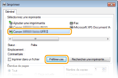 Appuyez ou cliquez sur [Périphériques] [Imprimer] le pilote de fax de cet appareil [Imprimer].Si vous réalisez des impressions en suivant cette méthode, seul est disponible un nombre limité de paramètres d'impression.