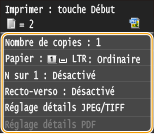 *2 Le réglage de <Réglages d'impression sécurisée> sur <Désactivé> permet d'imprimer un volume maximal de données de 50 Mo (Réglages d'impression sécurisée).