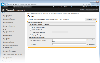 Saisissez un mot de passe de 32 caractères alphanumériques maximum pour crypter les données exportées. Saisissez le même mot de passe dans [Confirmer]. Si la case [Carnet d'adresses] ou [Réglages/Enregistrement] est cochée, les données ne peuvent pas être exportées sans mot de passe.
