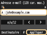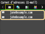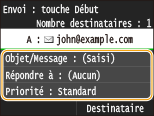 Si vous définissez plusieurs destinataires, le deuxième destinataire et les suivants doivent être enregistrés dans le carnet d'adresses ou sur le serveur LDAP. Vous ne pouvez définir en CC et en CCI que des destinataires enregistrés dans le carnet d'adresses. Pour utiliser le carnet d'adresses ou un serveur LDAP, vous devez préalablement exécuter la procédure d'enregistrement.