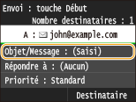 Pour envoyer des e-mails directement depuis l'appareil, vous devez effectuer plusieurs opérations préparatoires, notamment la définition des paramètres du serveur de messagerie. Définition des paramètres de numérisation (envoi d'e-mails, envoi et réception d'I-Fax)