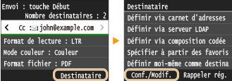 Si votre bureau dispose d'un serveur LDAP, vous pouvez définir un destinataire au moyen des informations utilisateur qui y sont stockées. Accédez au serveur LDAP à l'aide de l'appareil pour rechercher les informations utilisateur, puis définissez-les en tant que destinataires.