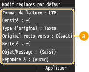 <Menu>  <Réglages de lecture>  <Réglages E-mail>  <Modifier les réglages par défaut>  Sélectionnez le réglage  Modifiez la valeur par défaut de l'option sélectionnée  <Appliquer>