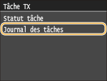 ![]() <Journal des tâches TX>Affiche une liste des documents envoyés. <OK> s'affiche si un document a bien été envoyé tandis que <Erreur> s'affiche en cas d'échec de l'envoi, que ce soit en raison d'une annulation ou d'une erreur.