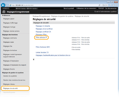 Cliquez sur [Réglages de sécurité]  [Filtre adresse IP].