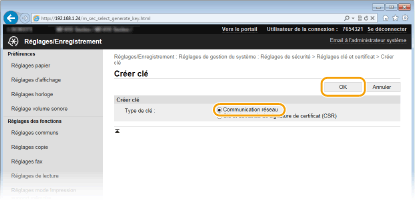 Il est possible de générer une paire de clés sur l'appareil lorsqu'elle est nécessaire à une communication cryptée en TLS (Transport Layer Security). Vous pouvez utiliser le cryptage TLS lorsque vous accédez à l'appareil au moyen de l'IU distante. Vous pouvez enregistrer jusqu'à cinq paires de clés (en comptant les paires préinstallées) sur l'appareil. Les certificats auto-signés sont utilisés avec les paires de clés générées dans "Communication réseau". Avec une "Clé et demande de signature de certificat (CSR)", vous pouvez demander un certificat numérique émis par une autorité de certification pour la paire de clés générée par l'appareil.