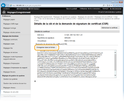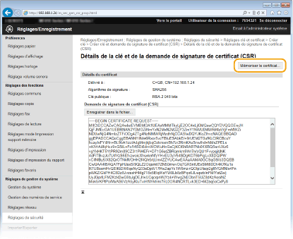 Vous ne pouvez pas utiliser la paire de clés générées par la demande de signature de certificat (CSR) tant que le certificat n'est pas enregistré. Une fois que l'autorité de certification a émis le certificat numérique, enregistrez-le à l'aide de la procédure ci-dessous.