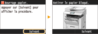 En cas de bourrage papier, le message <Bourrage papier.> s'affiche à l'écran. Appuyez sur <Suivant> pour examiner les solutions les plus simples*. Si vous avez des difficultés à comprendre les procédures apparaissant à l'écran, consultez les sections suivantes pour éliminer les bourrages papier.