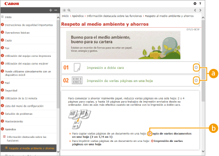 Haga clic para configurar los parámetros que determinan cómo se visualiza el e-Manual, como el diseño o el formato de caracteres.