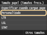 Una vez registradas las opciones de papel predeterminadas, la pantalla de configuración del papel no aparece cuando se carga papel, y se utiliza la misma configuración en todo momento. Si carga un tamaño o tipo de papel diferentes sin cambiar las opciones de papel, es posible que el equipo no imprima correctamente. Para evitar este problema, seleccione <Especificar cuando cargue papel> en el paso 3, y, a continuación, cargue el papel.