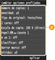 . Si cambia esta configuración predeterminada para adaptarla a las operaciones que realiza con mayor frecuencia, puede eliminar la necesidad de realizar la misma configuración cada vez que realice copias.