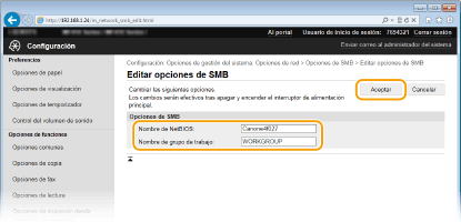 Bloque de mensajes del servidor (SMB) es un protocolo para compartir recursos, como archivos e impresoras, con más de un dispositivo en una red. El equipo utiliza SMB para guardar los documentos leídos en una carpeta compartida. En función de la red, es posible que deba configurar el nombre de NetBIOS y el nombre del grupo de trabajo.