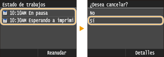 <Trabajos de copia/impresión>  <Estado de trabajos>  Seleccione el documento en la pantalla <Est. trabajos copia/impresión>  <Cancelar>  <Sí>